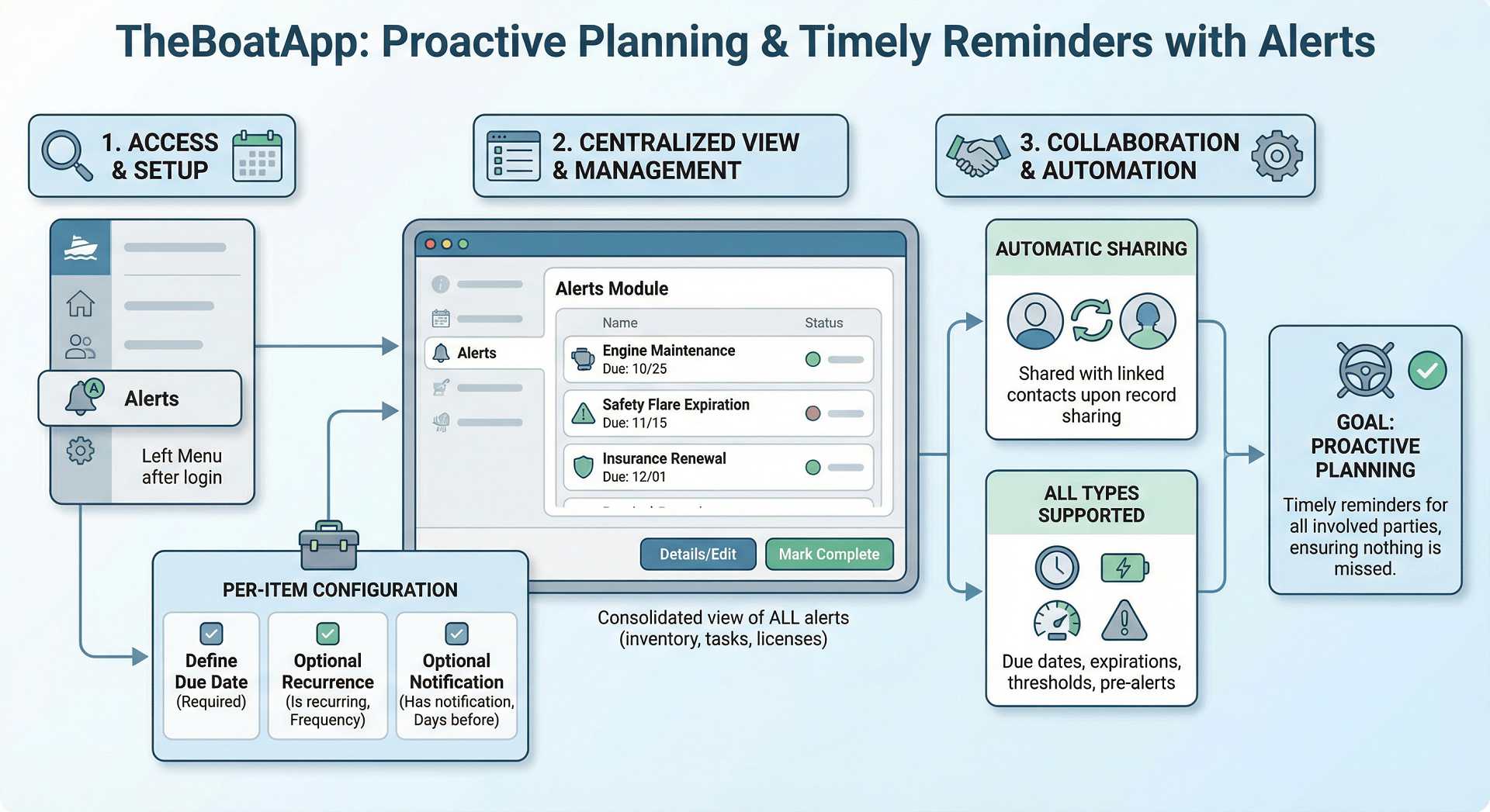 In short, you are strongly advised(!) to configure an alert for each item you consider that a Point-of-Action is needed to be taken, defining also when this action needs to be performed (i.e. "Due Date") as well as how many "Days before" the alert should be sent to you and your designated contacts. It might look a bit of extra work for you now but it will come handy for both you and your appointed contacts (e.g. family, skipper, technician, marina-staff, etc) to know in advance and plan accordingly!