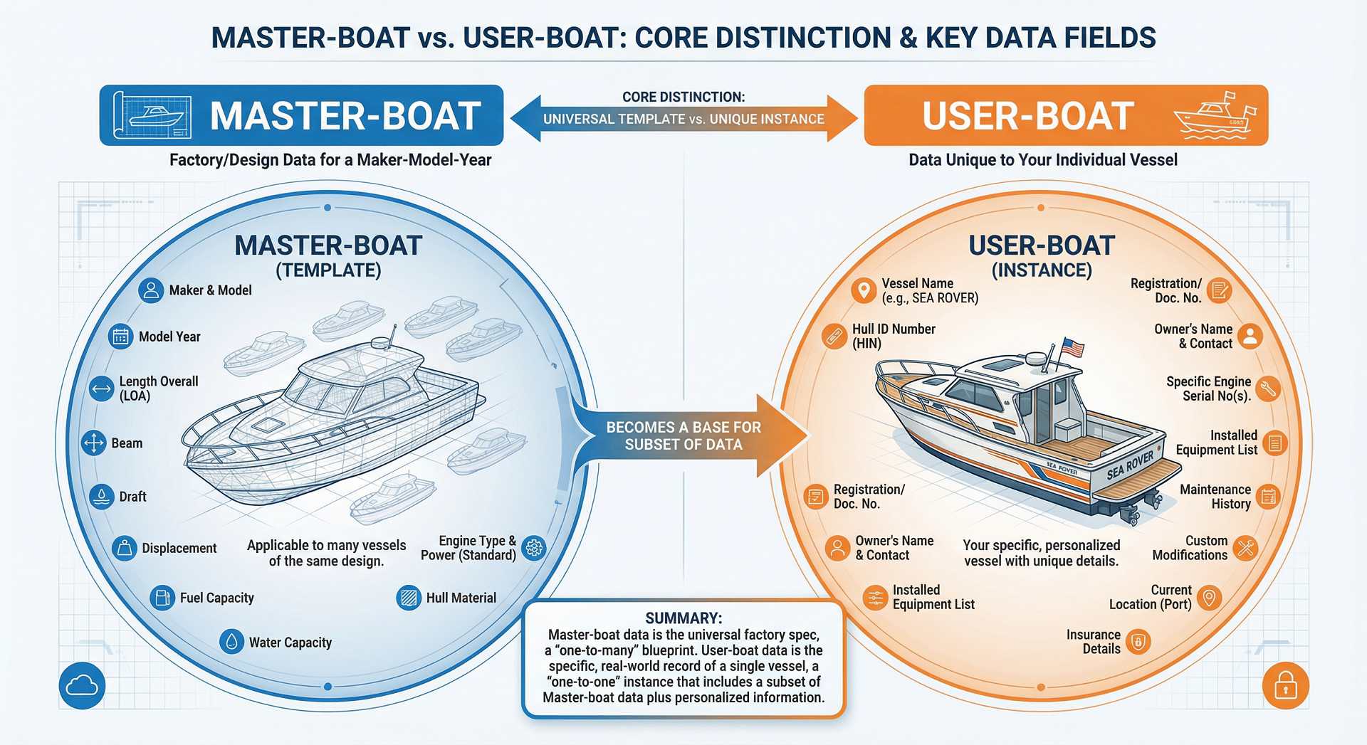 Master-boat vs. User-boat. Simply put, Master-boat refers to factory and design data and specs while User boat refers to the very specific named vessel of yours!