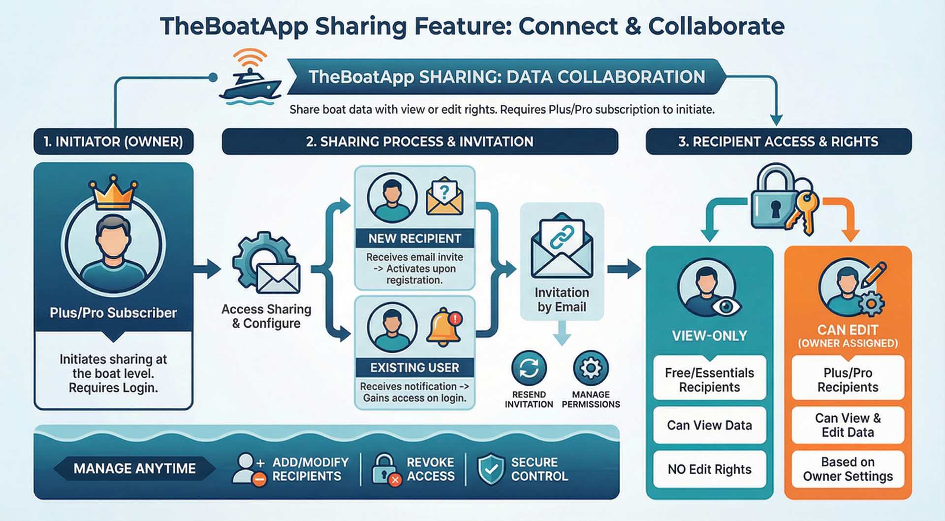 Sharing can be initiated by Plus/Pro subscribers only. Free/Essentials users may not share their own boat/records with other users, although they may be recipients of boat(s) shared by Plus/Pro subscribers (see below). To put this in better perspective, these are the user-to-user sharing “modes”: