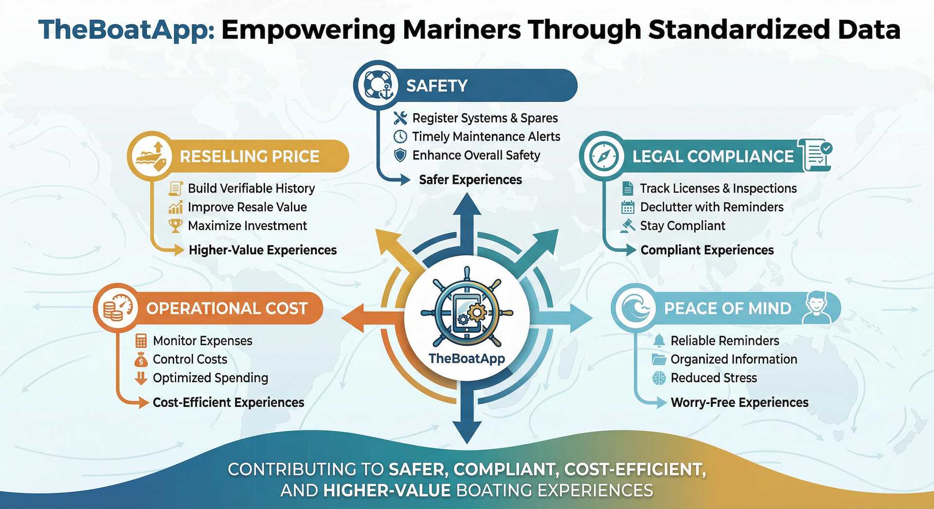 Following our Mission and Vision statements, our Value Proposition boils down to a simple concept: “We are here to empower mariners with tools to set new standards for boat management, safety and more. Cruise safe, with peace of mind!”. This is the result of the combined contribution of TheBoatApp in these pillars: