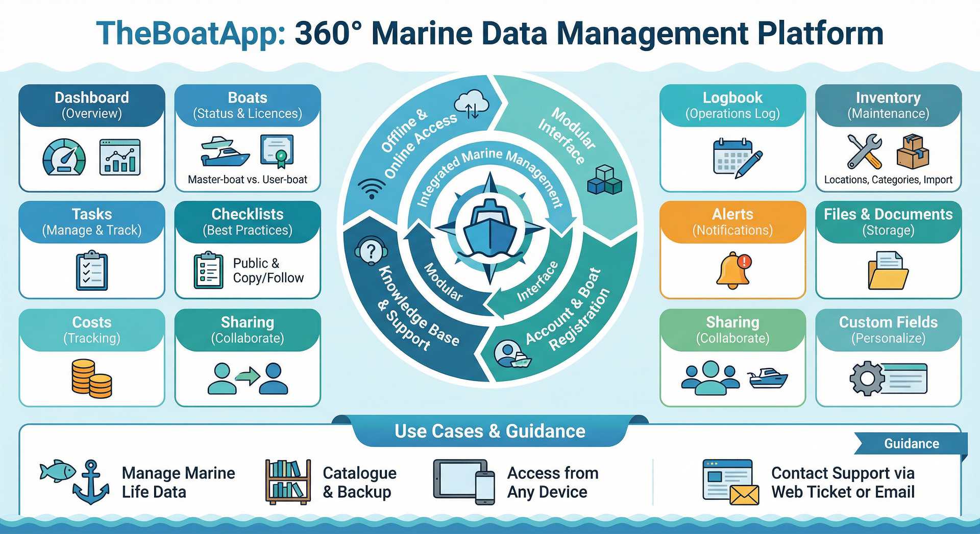 TheBoatApp provides intuitive Interface with separate modules, once for each needed function: logbook, inventory, maintenance, documents, checklists, tasks, alerts. In this knowledge-base, you will be able to find information on how to use TheBoatApp. In case you don't, no worries, just drop us a line by opening a web ticket or do so via email to Support@MarineDataCloud.com.